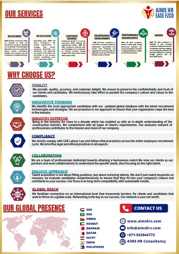 - Compliance – We strictly comply with UAE Labour Law and follow ethical practices across the entire employee recruitment cycle. We prioritize legal and ethical practices in all aspects.